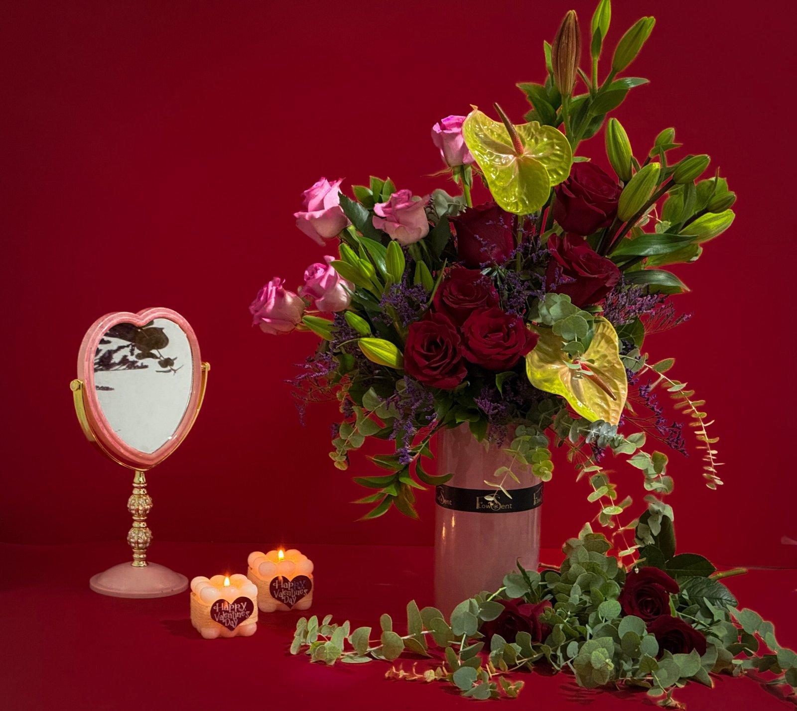 A refined mix of red and pink roses, accented with lilies, anthuriums, eucalyptus, and limonium, all styled in an elegant pink porcelain vase.