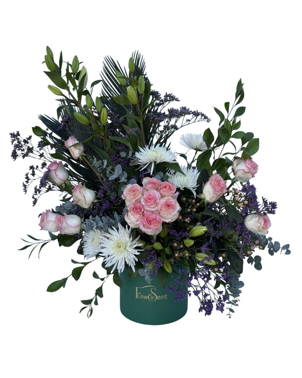 Soft pink roses sit at the heart of this design, surrounded by graceful lily buds, white chrysanthemums, lush greenery, eucalyptus, and delicate purple accents — all arranged in Flowsent’s signature green box for a fresh and sophisticated finish.