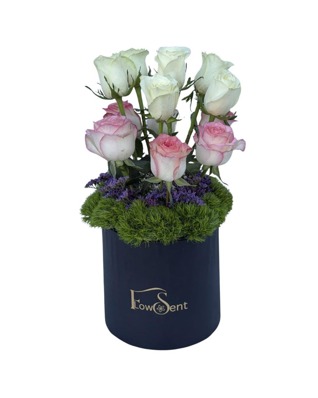 Soft pink Jumilia roses blend beautifully with crisp white blooms, delicate purple accents, and fresh greenery — all arranged in Flowsent’s signature black box for a sophisticated finish.