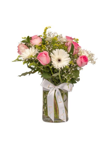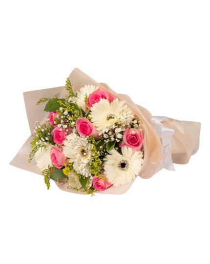 Delight is a celebration of beauty and grace, where soft pink Revival roses meet the timeless charm of crisp white gerberas. Accented with delicate white baby flowers and lush greenery, this arrangement brings a fresh, uplifting feel to any space. Perfect for gifting or brightening up your own home, it’s a bouquet that speaks the language of joy and tenderness.