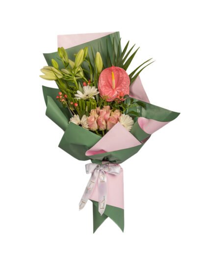 Meet Cherie – a bouquet that whispers elegance in every detail. Delicate pink Revival roses, striking green Anthuriums, soft white Gerberas, and a single graceful Lily are all embraced by airy Eucalyptus and touches of purple Limonium. It’s a poetic blend of florals and textures, wrapped with a tender balance of charm and grace.
