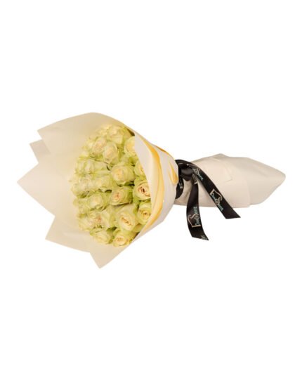 This bouquet features 35 imported white roses, arranged in a clean, modern silhouette, wrapped in soft white paper and tied with a bold black ribbon.