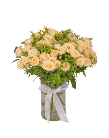 A bouquet of delicate cream spray roses paired with rich greenery, creating a composition that’s effortlessly sophisticated. Perfect for bringing a serene charm to any celebration, this arrangement speaks of grace, warmth, and refined taste.