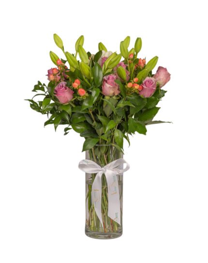 Tamara is a poetic arrangement that brings together the romantic depth of mauve roses with the serene beauty of white lilies. Accents of delicate pink hypericum add a playful touch, all framed by lush seasonal greenery in a sleek glass vase. Perfectly balanced, it’s a bouquet that whispers sophistication and warmth in every petal.