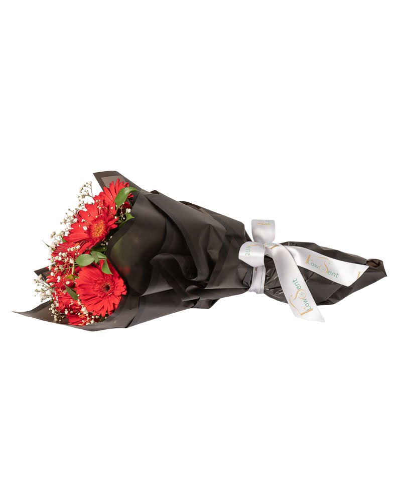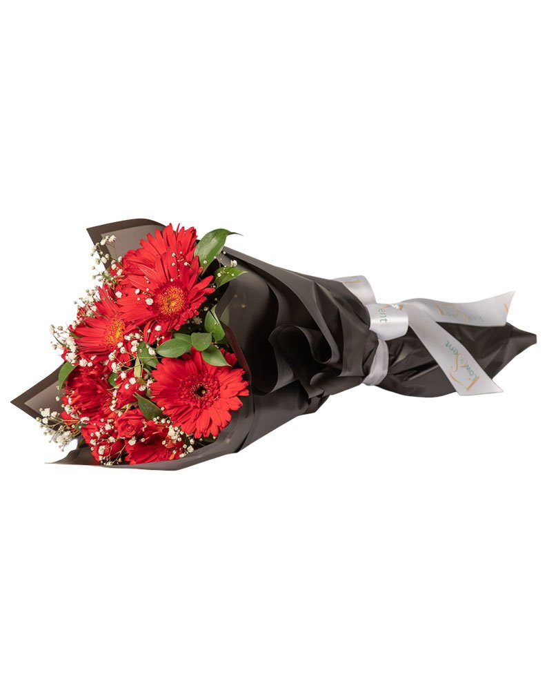 Crafted with radiant red Gerbera and matching red spray roses, wrapped elegantly in deep black, this bouquet is the perfect gesture for moments of passion, apologies, or sweet longing.