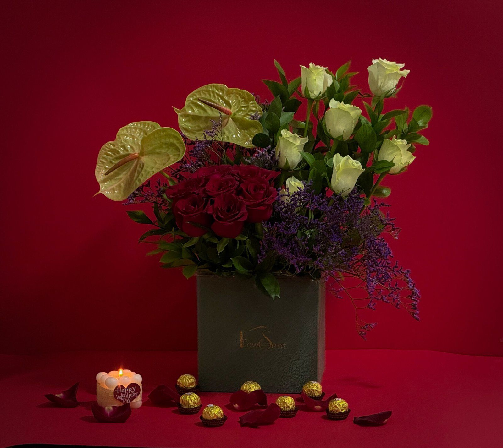 This refined arrangement combines red and white roses with graceful anthuriums and soft limonium, designed in Flowsent’s signature green box.