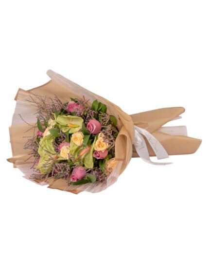 Meet Cherie – a bouquet that whispers elegance in every detail. Delicate pink Revival roses, striking green Anthuriums, soft white Gerberas, and a single graceful Lily are all embraced by airy Eucalyptus and touches of purple Limonium. It’s a poetic blend of florals and textures, wrapped with a tender balance of charm and grace.