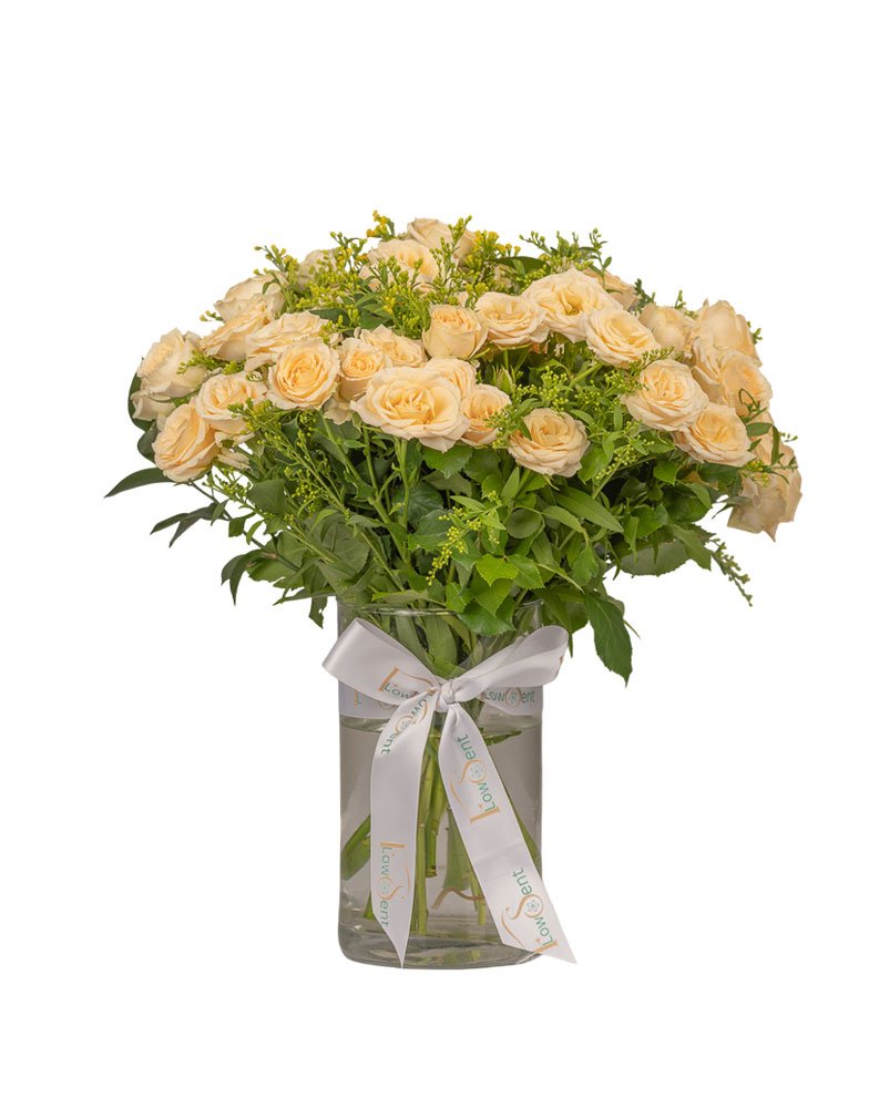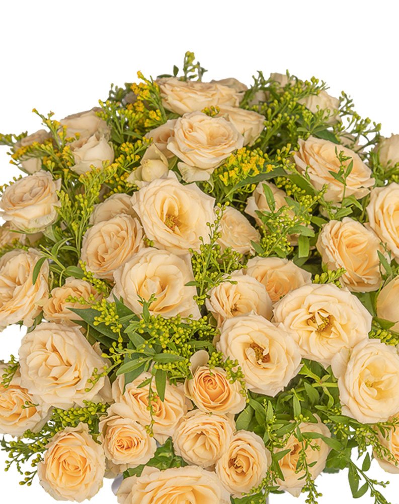 A bouquet of delicate cream spray roses paired with rich greenery, creating a composition that’s effortlessly sophisticated. Perfect for bringing a serene charm to any celebration, this arrangement speaks of grace, warmth, and refined taste.